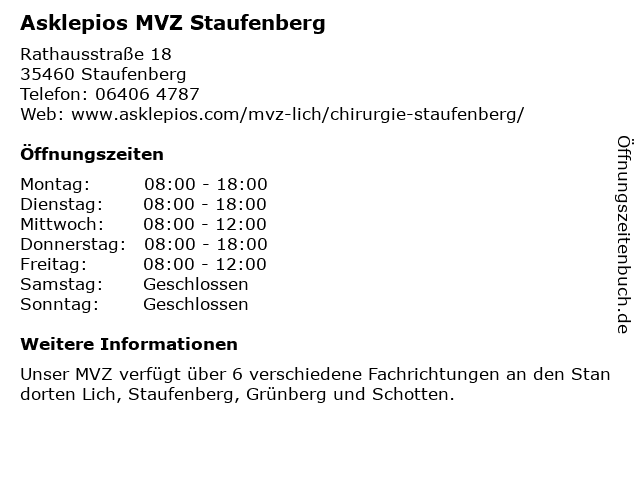 | Öffnungszeiten Asklepios MVZ Staufenberg in Staufenberg anzeigen | |