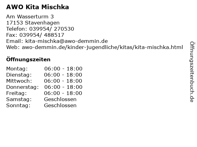 | Öffnungszeiten AWO Kita Mischka in Stavenhagen anzeigen | |