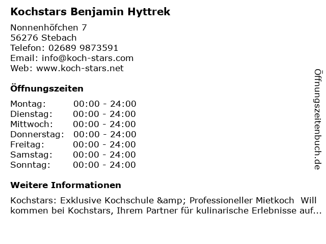 | Öffnungszeiten Kochstars Benjamin Hyttrek in Stebach anzeigen | |