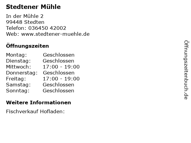 | Öffnungszeiten Stedtener Mühle in Stedten anzeigen | |