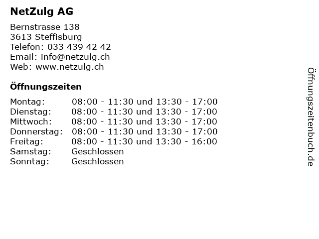 | Öffnungszeiten NetZulg AG in Steffisburg anzeigen | |