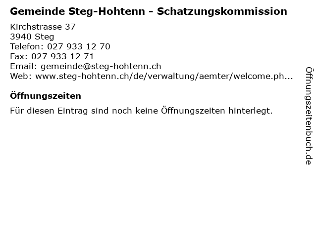 Branchen & Suchbegriffe zu Gemeinde Steg-Hohtenn - Schatzungskommission:amt, behörde, gemeinde, hohtenn, schatzungskommission, steg, verwaltung |