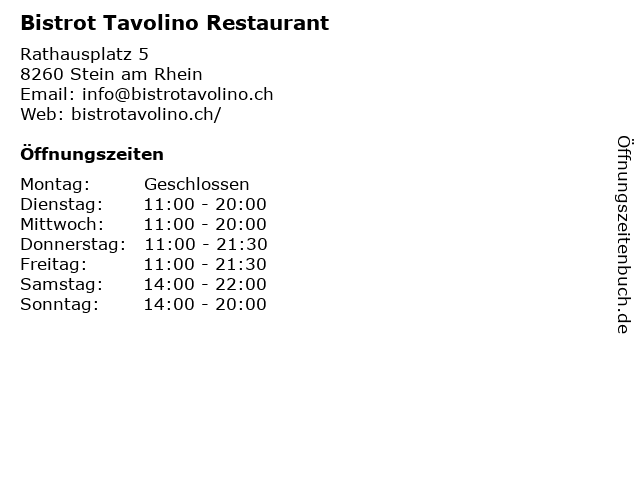| Öffnungszeiten Bistrot Tavolino Restaurant in Stein am Rhein anzeigen | |