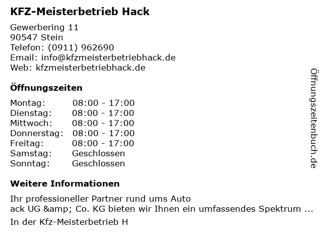 | Öffnungszeiten KFZ-Meisterbetrieb Hack in Stein anzeigen | |