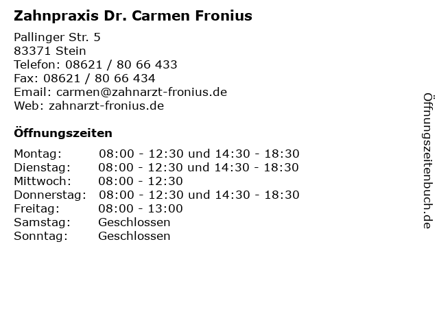 | Öffnungszeiten Zahnpraxis Dr. Carmen Fronius in Stein anzeigen | |