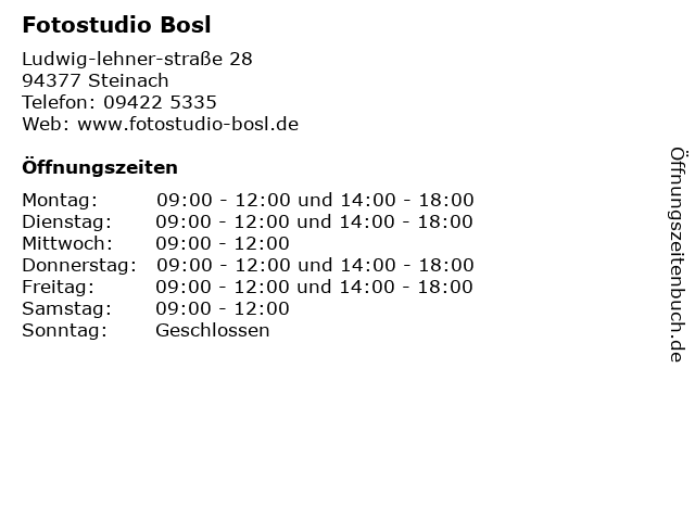 | Öffnungszeiten Fotostudio Bosl in Steinach anzeigen | |