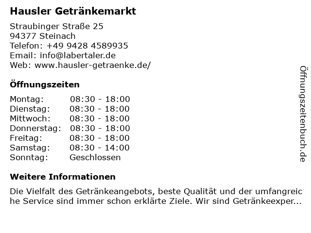 | Öffnungszeiten Hausler Getränkemarkt in Steinach anzeigen | |