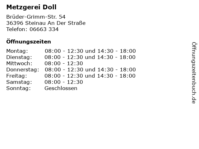 | Öffnungszeiten Metzgerei Doll in Steinau An Der Straße anzeigen | |