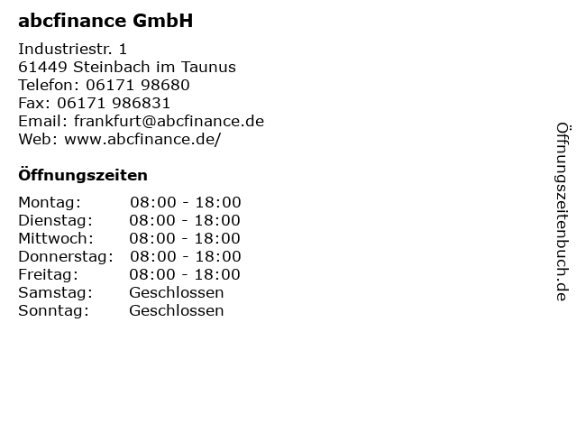 | Öffnungszeiten abcfinance GmbH in Steinbach im Taunus anzeigen | |