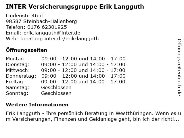 3 Garten- u Landschaftsplanung Erik Hanf (Entfernung: 12,30 km) Johann-Sebastian-Bach-Str. 74, 98529 Suhl 4 Mecklenburgische Versicherungsgruppe - Generalvertretung Hans-Dieter Ott & Martin Bendner-Spindler (Entfernung: 12,57 km) Hoffnung 3, 98527 Suhl 5 Mecklenburgische Versicherungsgruppe Dieter Heß & Hans-Dieter Ott (Entfernung: 12,57 km) Hoffnung 3, 98527 Suhl 6 MÜNCHENER VEREIN Versicherungsgruppe Geschäftsstelle Versicherungen und Finanzierungen (Entfernung: 12,97 km) Bahnhofstr. 11, 98527 Suhl |