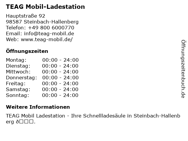 Öffnungszeiten TEAG Mobil-Ladestation in Steinbach-Hallenberg anzeigen