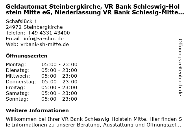 Branchen & Suchbegriffe zu Geldautomat Steinbergkirche, VR Bank Schleswig-Holstein Mitte eG, Niederlassung VR Bank Schlesig-Mittelholstein:bank, eg, geldautomat, holstein, mitte, mittelholstein, niederlassung, schlesig, steinbergkirche, vr |