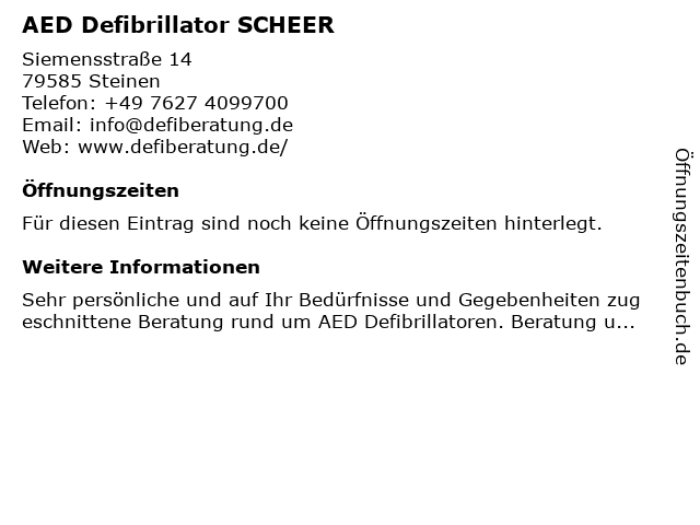 | Öffnungszeiten AED Defibrillator SCHEER in Steinen anzeigen | |