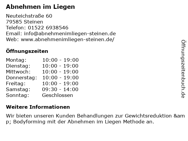 | Öffnungszeiten Abnehmen im Liegen in Steinen anzeigen | |