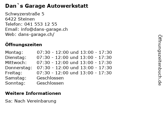 | Öffnungszeiten Dan`s Garage Autowerkstatt in Steinen anzeigen | |