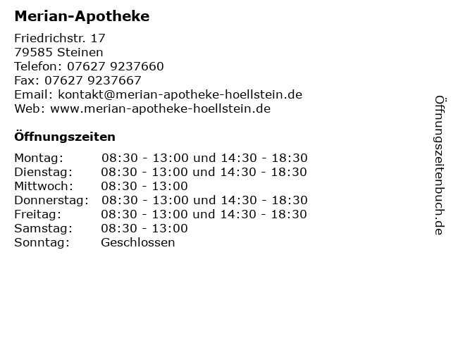 | Öffnungszeiten Merian-Apotheke in Steinen anzeigen | |