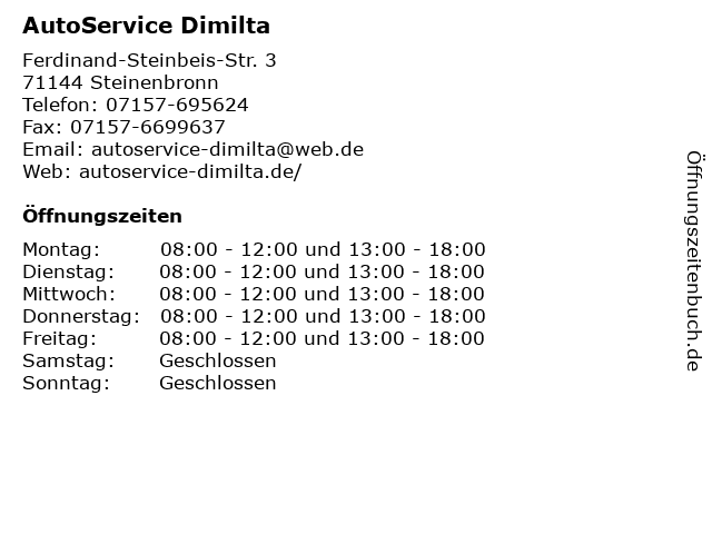 | Öffnungszeiten AutoService Dimilta in Steinenbronn anzeigen | |