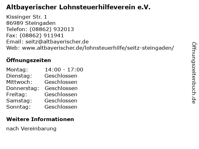 4 Lohnsteuerberatungsverbund e. V. -Lohnsteuerhilfeverein- Beratungsstelle Rottenbuch (Entfernung: 8,43 km) Krummengraben 10, 82401 Rottenbuch 5 Altbayerischer Lohnsteuerhilfeverein e.V. - Peiting (Entfernung: 11,42 km) Freistr. 10, 86971 Peiting 6 Lohnsteuerberatungsverbund e. V. -Lohnsteuerhilfeverein- Beratungsstelle Schongau (Entfernung: 13,07 km) Zweigstraße 8, 86956 Schongau |