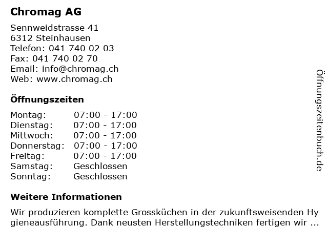 | Öffnungszeiten Chromag AG in Steinhausen anzeigen | |
