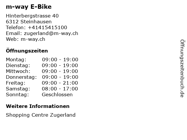 | Öffnungszeiten m-way E-Bike in Steinhausen anzeigen | |