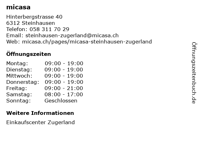 | Öffnungszeiten micasa in Steinhausen anzeigen | |