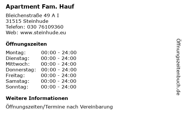 | Öffnungszeiten Apartment Fam. Hauf in Steinhude anzeigen | |