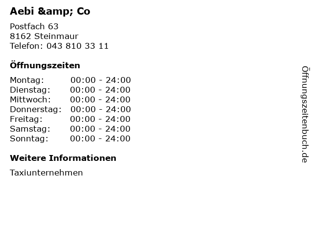 | Öffnungszeiten Aebi & Co in Steinmaur anzeigen | |