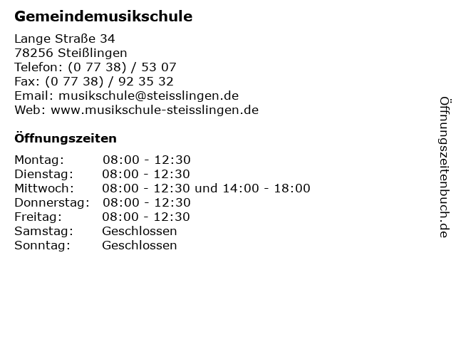 | Öffnungszeiten Gemeindemusikschule in Steißlingen anzeigen | |
