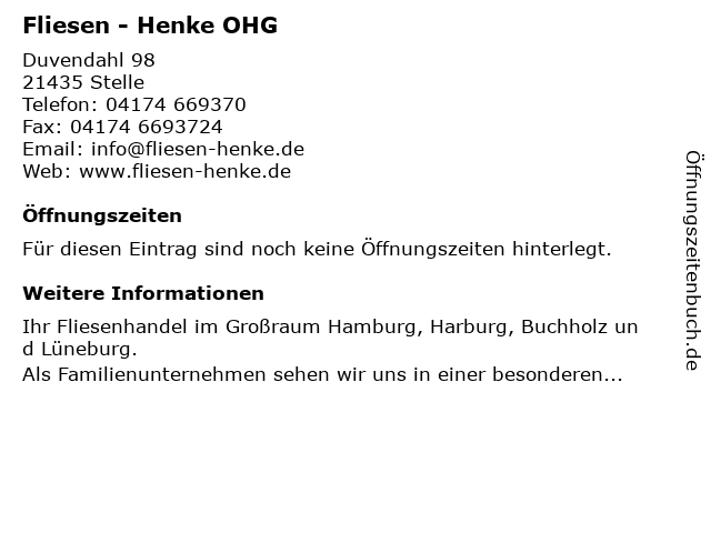 | Öffnungszeiten Fliesen - Henke OHG in Stelle anzeigen | |