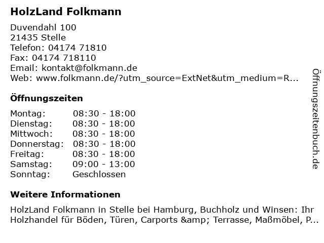 | Öffnungszeiten HolzLand Folkmann in Stelle anzeigen | |