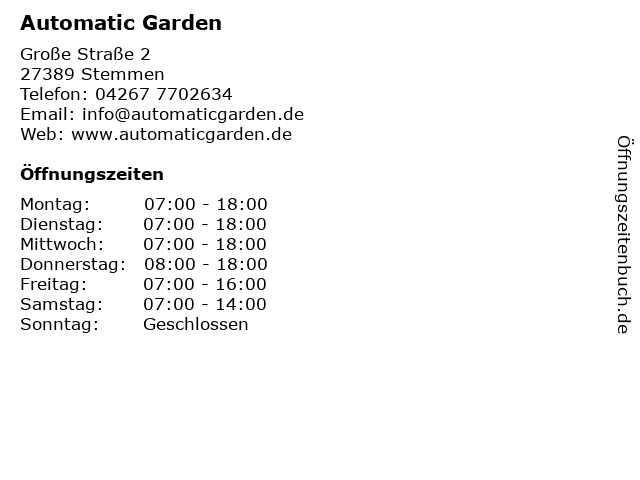 | Öffnungszeiten Automatic Garden in Stemmen anzeigen | |