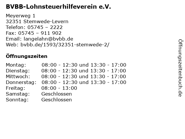 2 Lohnsteuerberatungsverbund e. V. -Lohnsteuerhilfeverein- Beratungsstelle Preußisch Oldendorf (Entfernung: 8,53 km) In der Hegge 1, 32361 Preußisch Oldendorf 3 Aktuell Lohnsteuerhilfeverein e.V. - Espelkamp (Entfernung: 11,84 km) Am waldbach 26, 32339 Espelkamp 6 Lohnsteuerhilfeverein HILO e.V. - Beratungsstellenleiterin Elisabeth Garbes (Entfernung: 14,12 km) Am Jägerbach 16, 32312 Lübbecke |