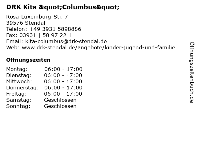 | Öffnungszeiten DRK Kita "Columbus" in Stendal anzeigen | |