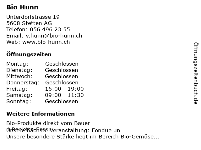 | Öffnungszeiten Bio Hunn in Stetten AG anzeigen | |