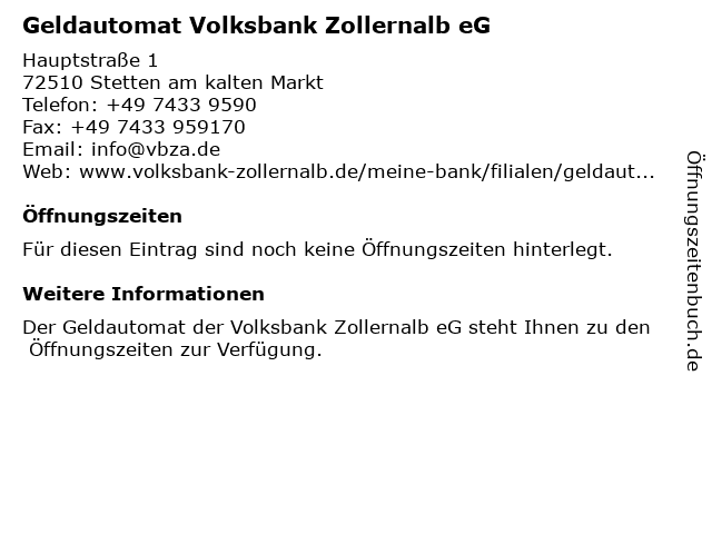 Geldautomat Volksbank Zollernalb eG in Stetten am kalten Markt: Telefonnummer, Öffnungszeiten und Adresse