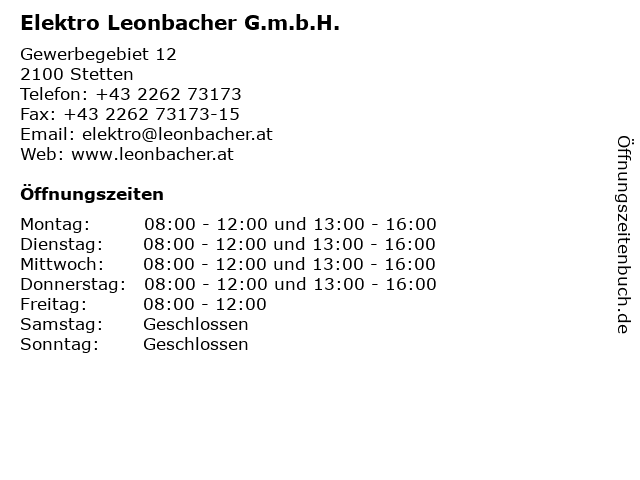 | Öffnungszeiten Elektro Leonbacher G.m.b.H. in Stetten anzeigen | |