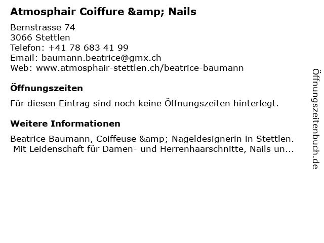 Branchen & Suchbegriffe zu Atmosphair Coiffure & Nails:altersheim coiffeuse utzigen, atmosphair, atmosphair coiffure & nails stettlen, beatrice baumann coiffeuse stettlen, betriebscoiffeuse pflegeheim utzigen be, coiffeur & nagelstudio stettlen, coiffeur bern umgebung stettlen, coiffeur stettlen bern, coiffeur termin online stettlen, coiffeur weiterbildungen modern stettlen, coiffeuse stettlen termin buchen, coiffure, damen herren coiffeur stettlen, damencoiffeuse efz bern, hair & nails salon stettlen, hairstyling stettlen, herrencoiffeuse zollikofen, nageldesignerin stettlen, nails, selbständige coiffeuse stettlen seit 2007, verwöhn dienste coiffeur stettlen, wella haarprodukte coiffeur, wella haarprodukte coiffeur stettlen |