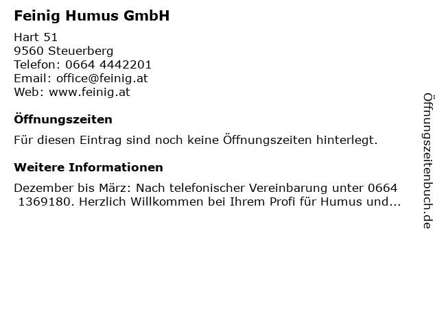 | Öffnungszeiten Feinig Humus GmbH in Steuerberg anzeigen | |