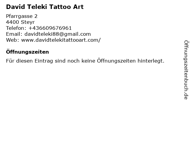 | Öffnungszeiten David Teleki Tattoo Art in Steyr anzeigen | |