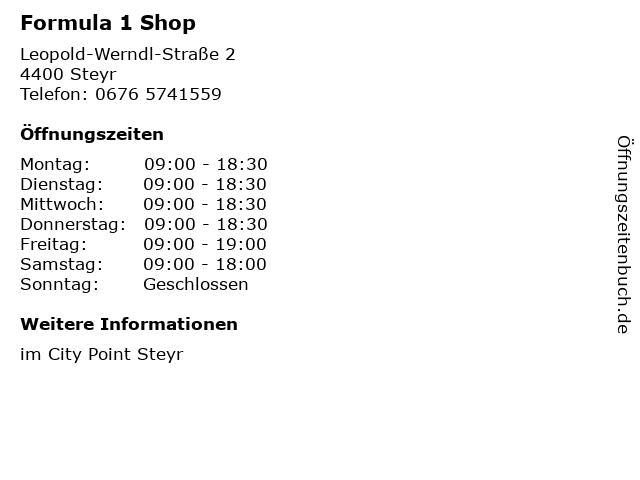 | Öffnungszeiten Formula 1 Shop in Steyr anzeigen | |