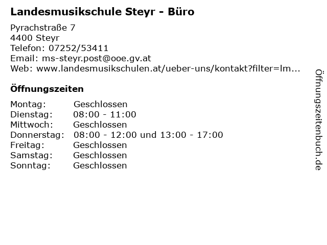 | Öffnungszeiten Landesmusikschule Steyr - Büro in Steyr anzeigen | |