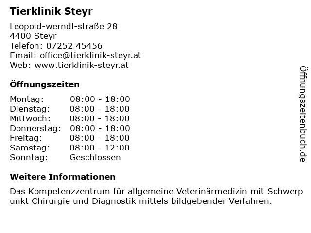| Öffnungszeiten Tierklinik Steyr in Steyr anzeigen | |