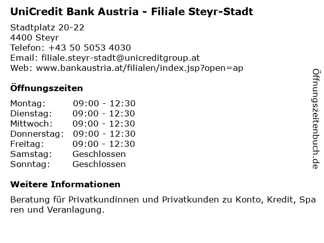 Branchen & Suchbegriffe zu UniCredit Bank Austria - Filiale Steyr-Stadt:austria, bank, privatkundinnen und privatkunden, stadt, steyr, unicredit |