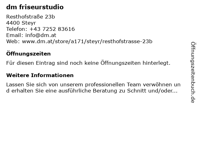 | Öffnungszeiten dm friseurstudio in Steyr anzeigen | |