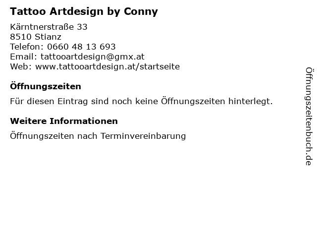 | Telefonnummer Tattoo Artdesign by Conny in Stianz (0660 48 13 693) anrufen | |