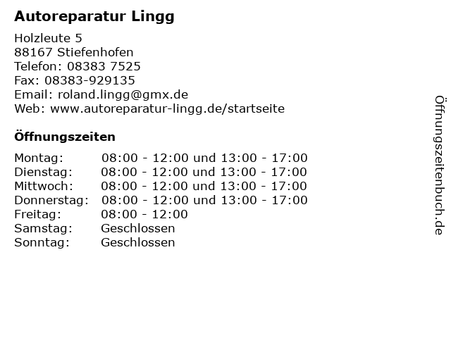 | Öffnungszeiten Autoreparatur Lingg in Stiefenhofen anzeigen | |