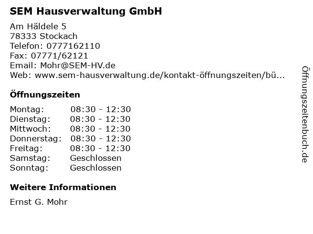 | Öffnungszeiten SEM Hausverwaltung GmbH in Stockach anzeigen | |
