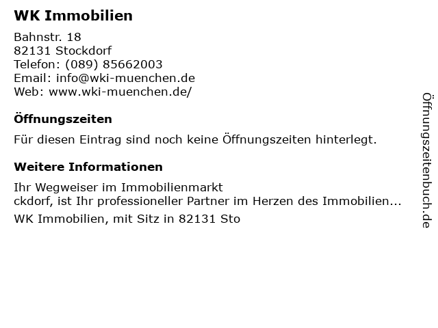 | Öffnungszeiten WK Immobilien in Stockdorf anzeigen | |