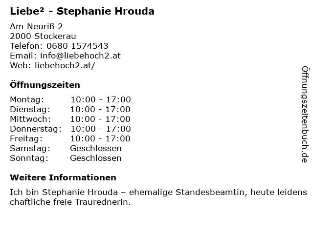 | Öffnungszeiten Liebe² - Stephanie Hrouda in Stockerau anzeigen | |