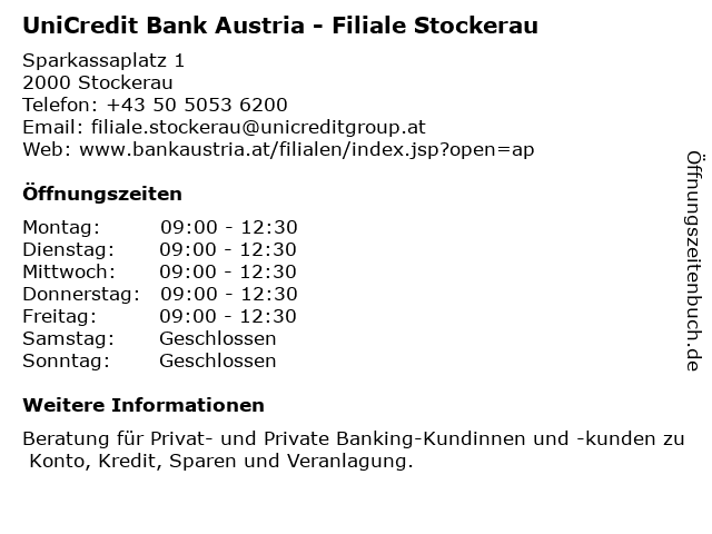Branchen & Suchbegriffe zu UniCredit Bank Austria - Filiale Stockerau:austria, bank, privat- und private banking-kundinnen und -kunden, stockerau, unicredit |